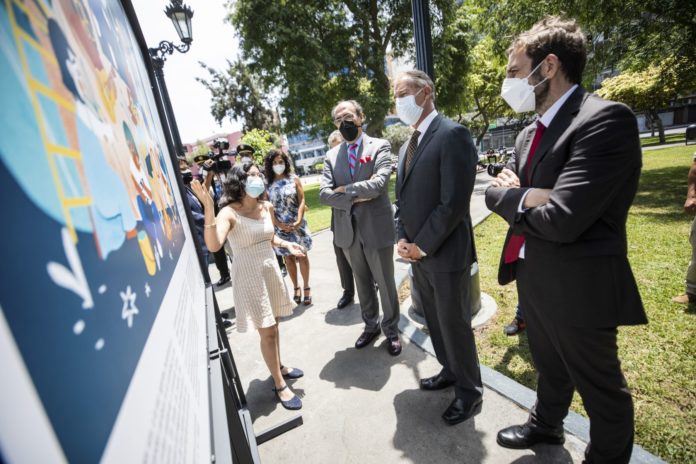 Las dos instituciones estuvieron en la inauguración de la muestra, ubicada en el parque Washington del Centro de Lima. Se trata de obras artísticas sobre palabras que ejemplifican la labor de la institución española.