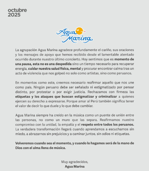 En medio del dolor, Agua Marina también alzó la voz por el país. “Ningún peruano debe ser señalado por pensar distinto o por exigir justicia. Amar al Perú también significa tener el valor de decir lo que duele y lo que debe cambiar”, señaló la agrupación en su mensaje.