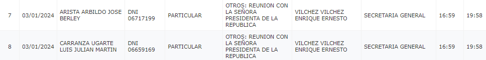 Registro de visitas de los exministros al Despacho Presidencial este 3/01/2024. (Fuente: Portal de Transparencia, Gobierno del Perú)