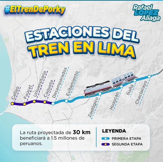 El recorrido tendría una extensión de 30 kilómetros y se estima un beneficio para 1.5 millones de limeños. Los coches de la empresa Caltrain cuentan con dos pisos, asientos de cuero, aire acondicionado y una capacidad para 100 pasajeros por unidad. El transporte ofrece áreas para guardar equipaje, bicicletas y un espacio habilitado para personas con discapacidad.