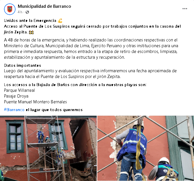 La Municipalidad de Barranco informó que el acceso al Puente de los Suspiros permanecerá cerrado por dos semanas tras el derrumbe de una casona como consecuencia de la filtración de agua que tenía la edificación, por lo que se habilitó tres accesos para la zona Bajada de Baños.