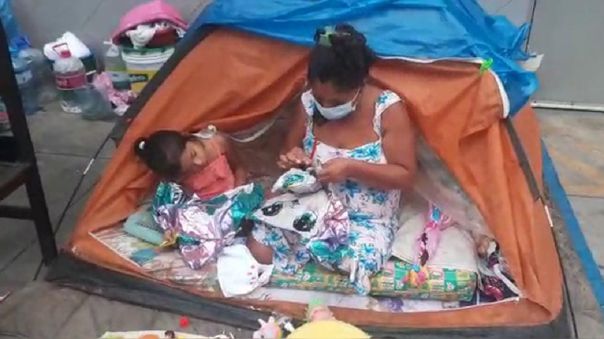 Jessica Paeza, alojada en una carpa en los exteriores del Hopital del Niño, solicitó apoyo para poder comprar pasajes y retornar a Piura y así ver a sus dos hijas que se encuentran delicadas.