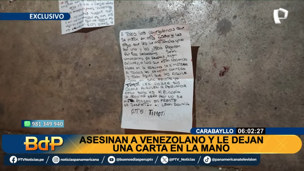 La nota estaba firmada por ‘Timoti’, un sujeto ya conocido en el ámbito criminal y asociado con asesinatos y cobros de cupos mayormente en los sectores de transporte, quien deja una carta con su firma en todos sus actos criminales, lo que da como sospecha de que el asesinato del joven puede haber sido por extorsión al negarse al pago de dichos cupos y la carta que se encontró en la escena parece validar esta sospecha.