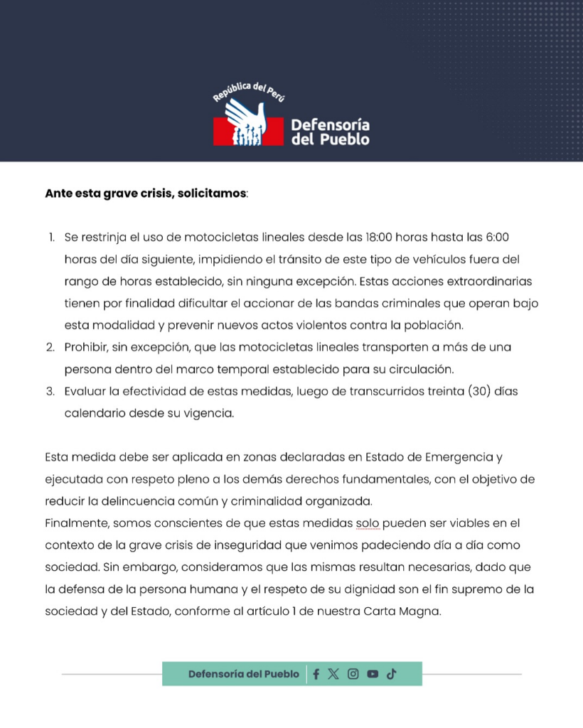 Los vecinos exigen más presencia por parte de los agentes policiales y que se lleve a cabo la ordenanza de la prohibición que se declaró hace unos días, el cual se trata de la prohibición de que dos personas estén a bordo de una moto lineal, esto con el fin de frenar las olas delictivas ocurridas en los últimos meses, lo que debería tener una vigencia de 30 días.