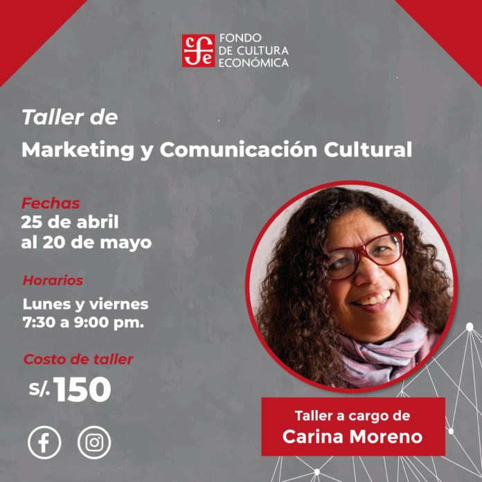 La gestora cultural y periodista, Carina Moreno Baca, dará un curso virtual de marketing y comunicación cultural de manera virtual desde el próximo 25 de abril hasta el 20 de mayo en el Fondo de Cultura Económica (FCE) con la finalidad de darles a los alumnos el conocimiento para que realicen un plan de marketing para productos culturales.