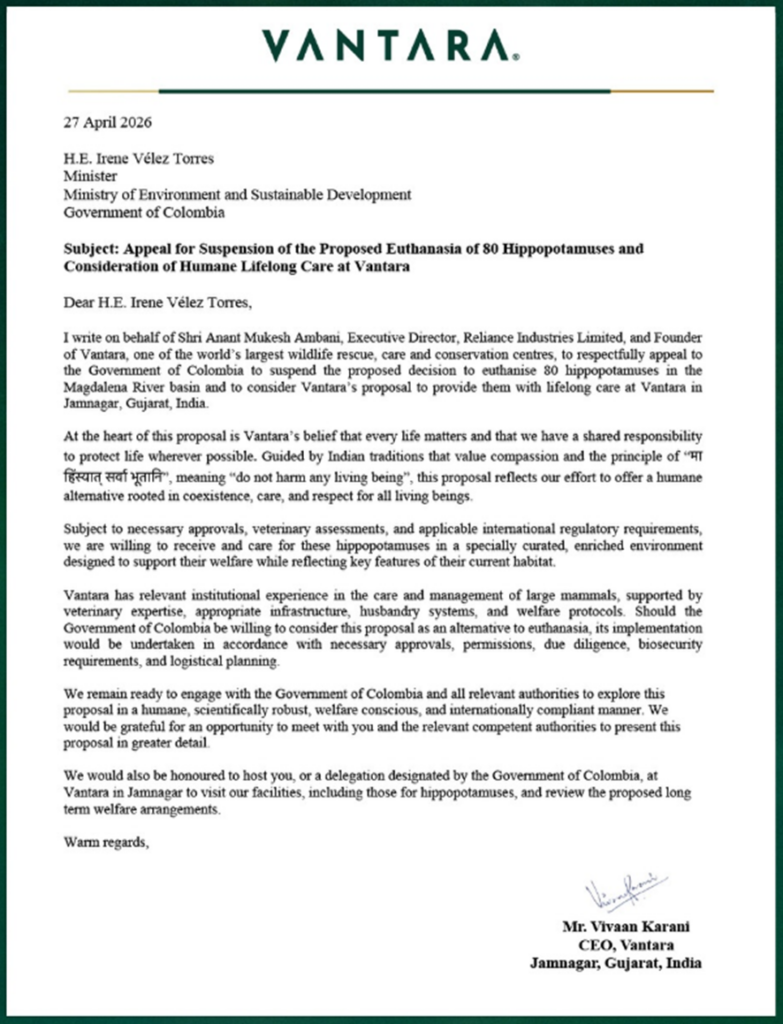 Anant Ambani, heredero de un multimillonario indio, ofreció su ayuda para trasladar a 80 ejemplares de hipopótamos, que fueron llevados a Colombia por el narcotraficante Pablo Escobar, hacia su centro de conservación Vantara, en el oeste de la India, a fin de evitar la eutanasia propuesta por el gobierno colombiano para controlar el crecimiento de esta especie en el río Magdalena, en el centro del país.