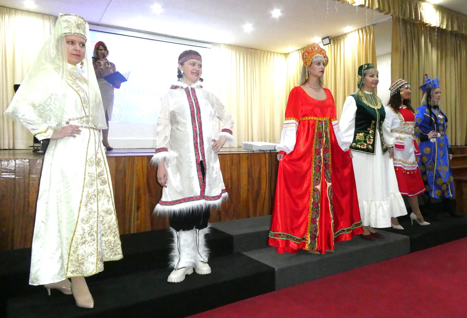 El desfile de trajes tradicionales rusos y caucásicos añadió un componente visual y simbólico, exaltando la riqueza cultural de las montañas, los pueblos guerreros y la feminidad serena de la nación rusa.