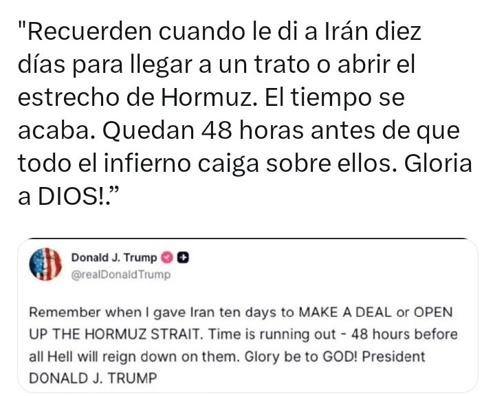 En otra publicación en su cuenta de Truth Social, el mandatario de 79 años recordó el plazo previo de 10 días que había otorgado para la apertura del Estrecho de Ormuz, por donde transita alrededor del 20% del petróleo y gas a nivel mundial, o desataría el “infierno” en Irán, lo que puede entenderse un bombardeo masivo en la nación islámica.