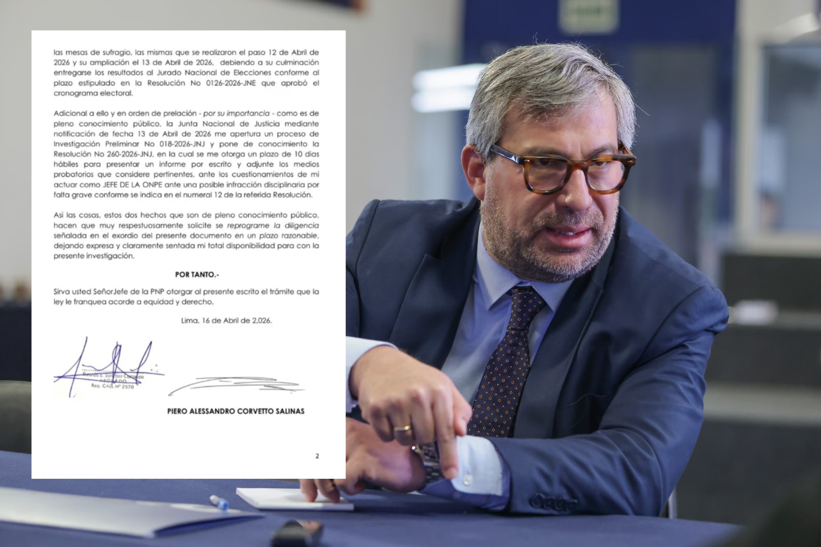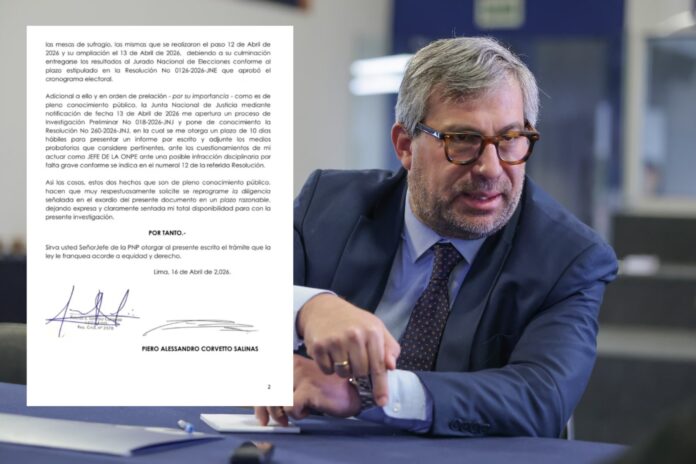 En el documento, Corvetto pide que cita para rendir declaraciones sea postergada y que se desarrolle de manera virtual; sin embargo, menciona su total predisposición para colaborar con la investigación sobre irregularidades detectadas en los comicios del domingo 12 de abril.