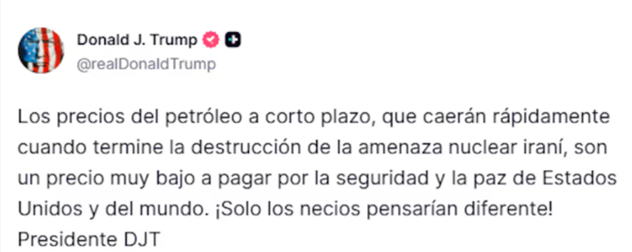 El pasado domingo 8 de marzo el presidente de los Estados Unidos, Donald Trump afirmó que el aumento en del petróleo es un precio a pagar por la erradicación de la amenaza nuclear de Irán. Y que los costos disminuirán al traer la paz a su nación y al resto el mundo.