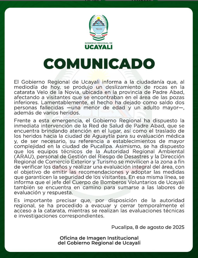 Un repentino deslizamiento de rocas alarmó a los visitantes en la catarata del Velo de la Novia, en la provincia de Padre Abad, Ucayali. El siniestro produjo el fallecimiento de dos personas y se reportaron 18 heridos, todos turistas que se encontraban dentro de las pozas interiores.
