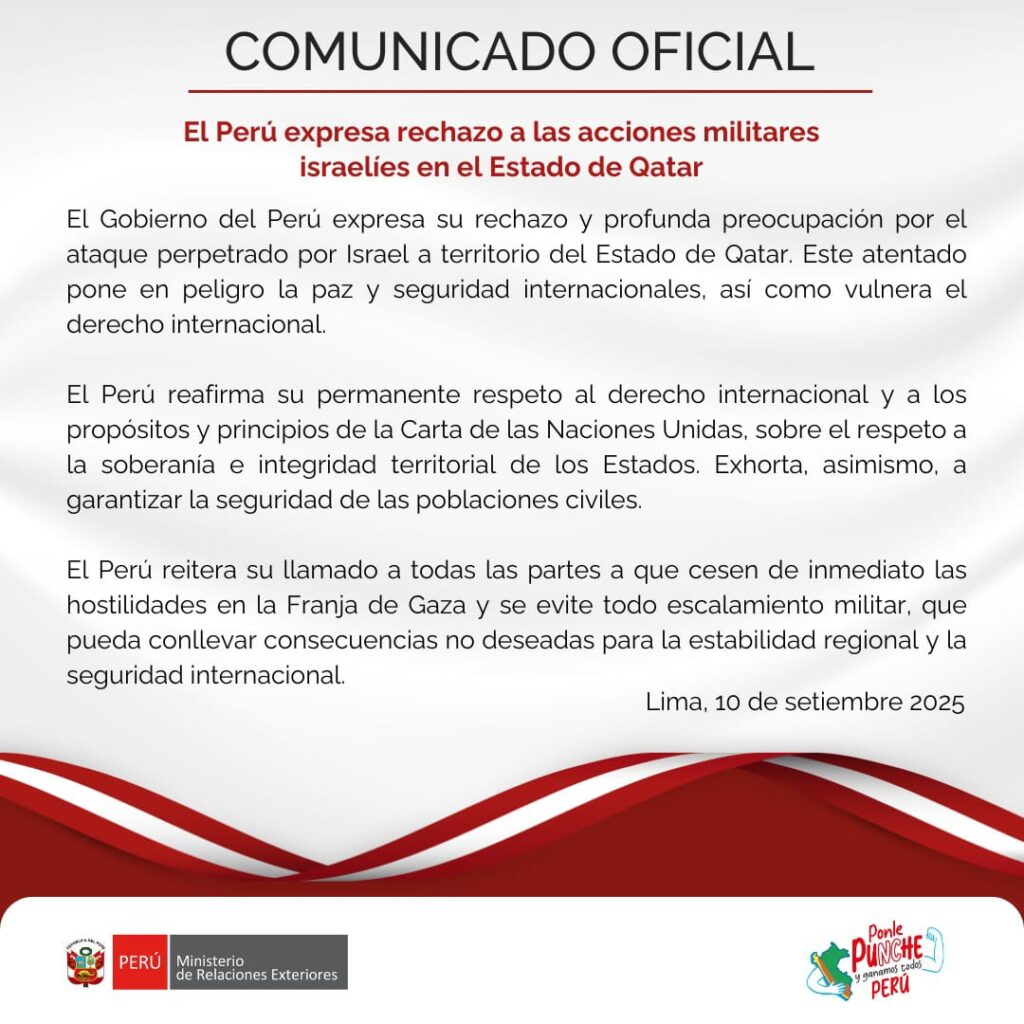 El gobierno del Perú manifestó su rechazo y preocupación por los ataques militares de Israel en el territorio de Estado de Qatar, que dejaron como resultado el fallecimiento de 2 integrantes del grupo palestino Hamás.