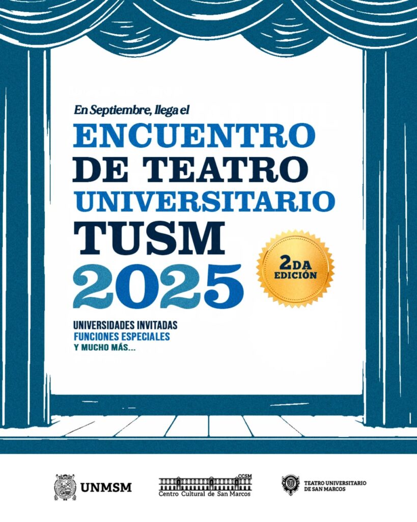 El Centro Cultural de San Marcos cada año en el mes de septiembre organiza una serie de actividades, entre las que destaca con el Segundo Encuentro de Teatro Universitario – TUSM 2025. Las funciones de la muestra se realizan los días 6, 13, 20 y 27 de septiembre a las 4:00 p.m., en el auditorio de la misma Casona; la entrada es libre para el público en general.