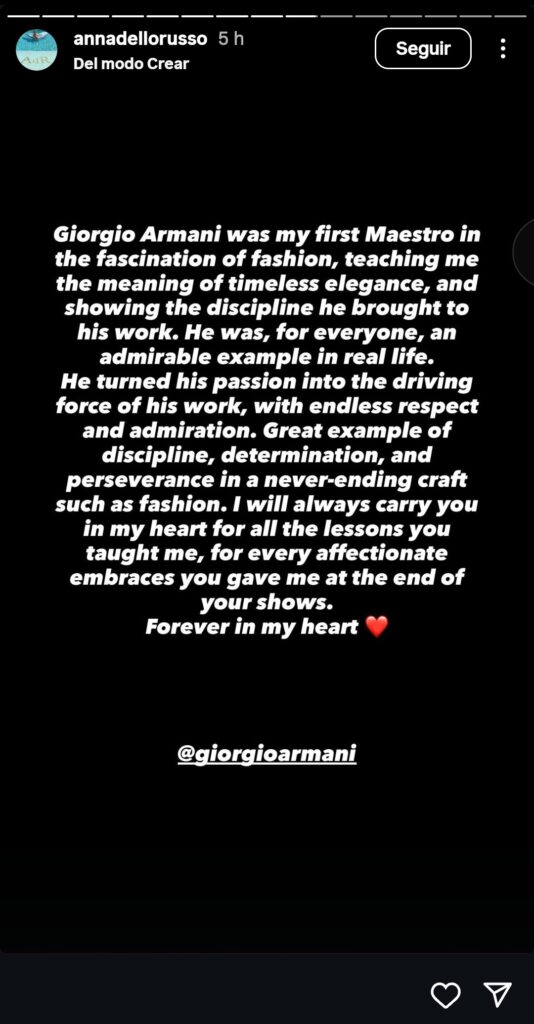 Donatella Versace, amiga y colega del fallecido, resumió toda su pena en un solo comentario en la publicación que hizo la casa de moda: un corazón roto. La estilista Anna Dello Russo también hizo presente sus condolencias en su cuenta de Instagram, publicando unas fotos que se tomó con el modisto y con un mensaje breve en sus historias: “Buen viaje Maestro Giorgio. Siempre te llevaré en mi corazón”