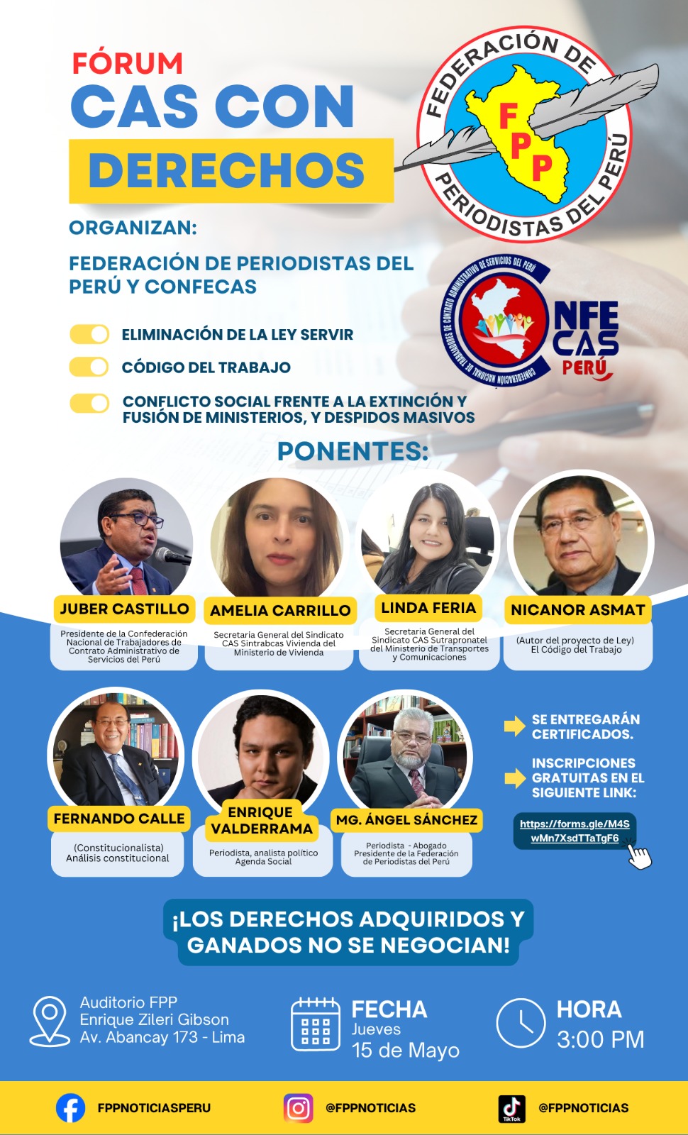 La Federación de Periodistas del Perú (FPP), en coordinación con la Confederación Nacional de Trabajadores de Contrato Administrativo de Servicios del Perú (CONFECAS), organiza el fórum nacional “CAS con Derechos”, un espacio de diálogo y análisis sobre la situación laboral del régimen CAS y los recientes conflictos sociales derivados de la reestructuración del Estado.
