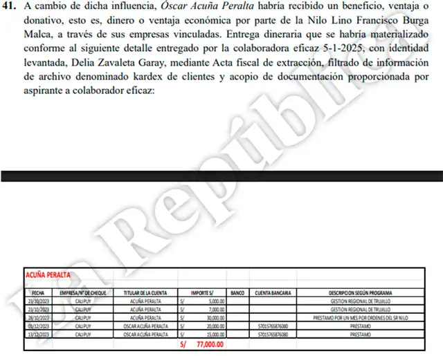 De acuerdo con la acusación fiscal, Acuña habría recibido S/77.000 del empresario fallecido Nilo Burga Malca, para facilitar los permisos necesarios para el funcionamiento de la planta de Frigoinca en Chepén, lo que le permitió continuar participando en el programa social Qali Warma. Los pagos, según la colaboradora eficaz 5-1-2025, se habrían efectuado en cantidades de entre S/5.000 y S/30.000, presentados como “préstamos” que nunca fueron devueltos.