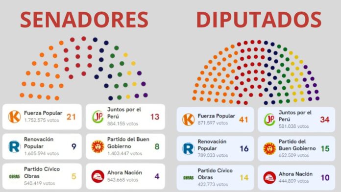 La cámara del senado estaría conformada por 60 senadores, de los cuales tendríamos en este nuevo parlamento, 21 representantes por la bancada de Fuerza Popular, 13, Juntos por el Perú, 9, Renovación Popular, 8 por el Partido del Buen Gobierno, 5, por el Partido Cívico Obras y 4 por Ahora Nación, estos seis partidos políticos serian quienes tomarían las próximas decisiones para el futuro del país.