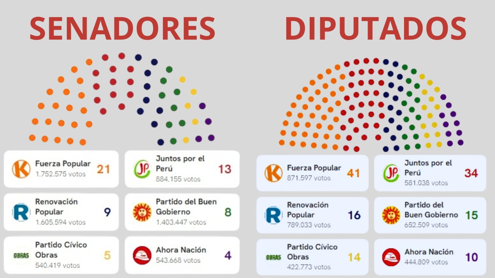 A su vez, la cámara de diputados que tendría un total de 130 parlamentarios, teniendo en esta cámara 41 escaños de Fuerza Popular, 34 de Juntos por el Perú, 16 por Renovación Popular, 15 por el Partido del Buen Gobierno, 14 por el Partido Cívico Obras y 10 por Ahora Nación, demostrando así que tanto en la cámara de senadores, como en la cámara de diputados, la señora Keiko Fujimori, presidenta del partido Fuerza Popular al ser 62 los representantes que entrarían en este nuevo Congreso le otorgaría mayoría parlamentaria.