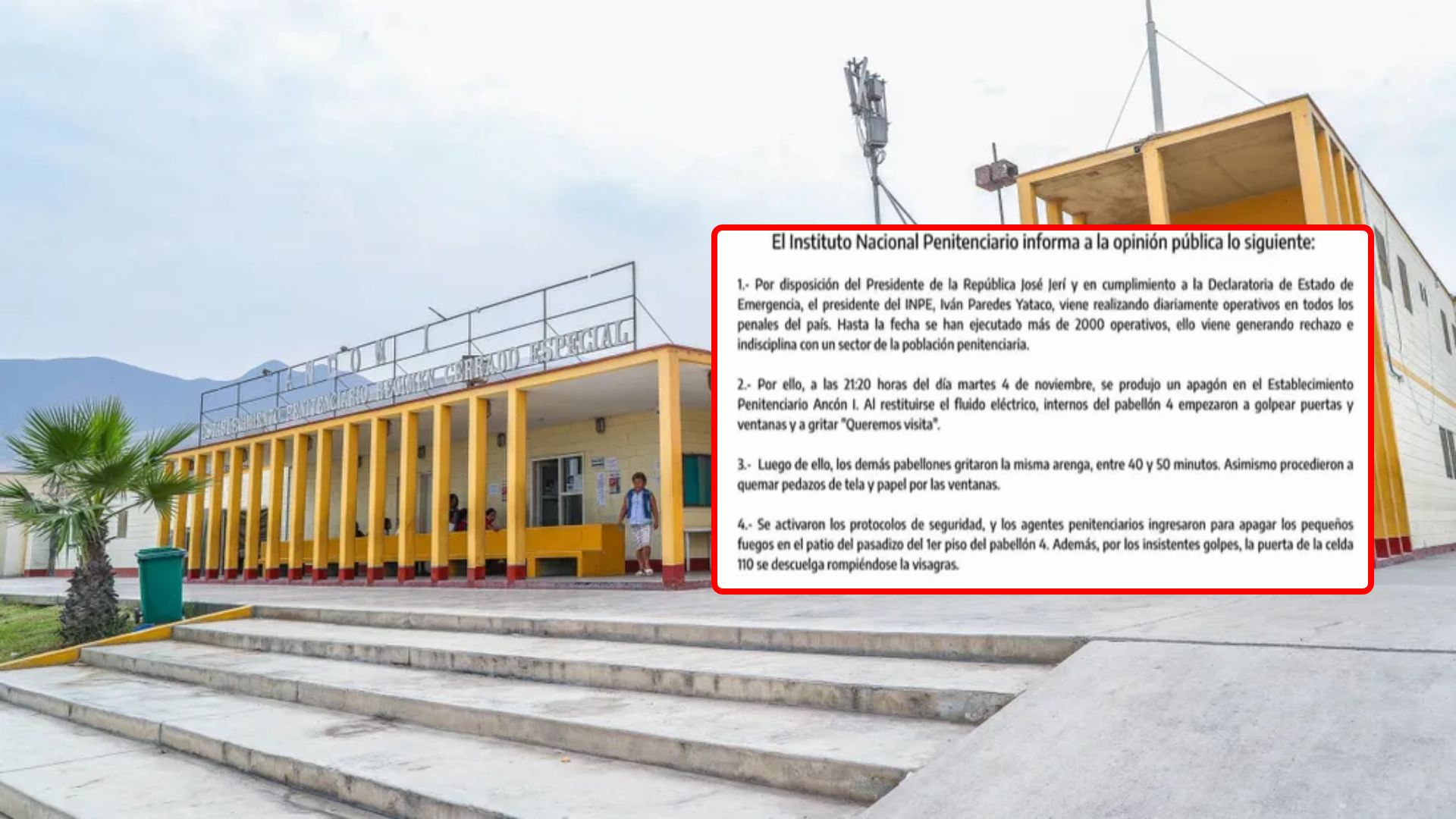 El Instituto Nacional Penitenciario (INPE) dio a conocer que la noche del martes 4 de noviembre, cerca de las 9:20 p. m., se produjo un intento de motín en el penal Ancón I, tras un corte de suministro eléctrico que impactó momentáneamente las instalaciones. El suceso tuvo lugar en el pabellón cuatro, donde un conjunto de internos empezó a golpear puertas y ventanas gritando “queremos visita