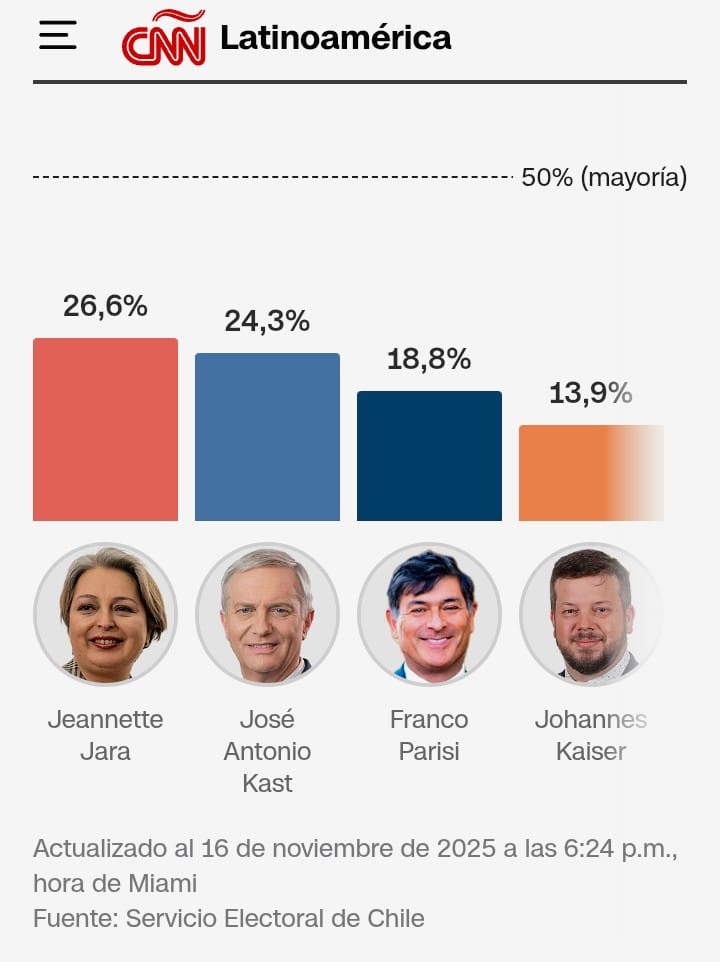 El conductor del programa político de CNN, Fernando Rincón, estimó esta noche que Kast tiene posibilidades de lograr el triunfo en el balotaje del próximo diciembre al dar por descontado el respaldo de los otros aspirantes que quedaron eliminados de la competencia electoral.