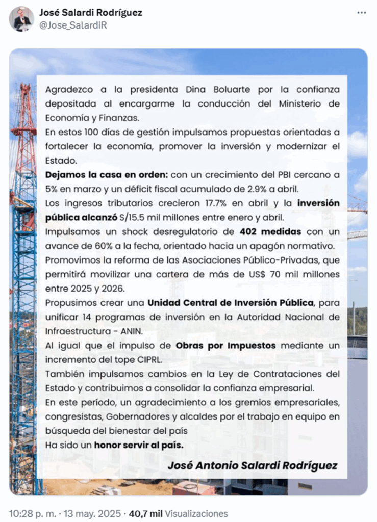 Mediante su cuenta de X (Twitter), José Salardi agradeció a la presidenta y rescató los logros de su gestión como titular del MEF durante los 100 días de su desempeño.