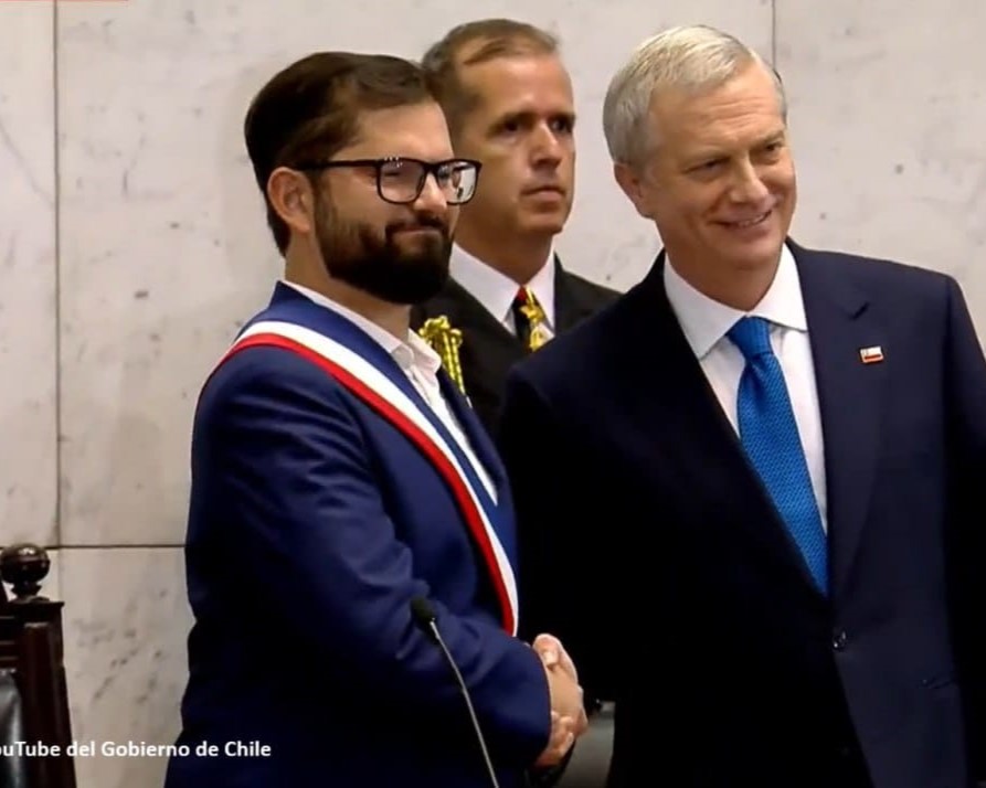 Recibió de manos de la titular del Senado, Paulina Núñez, la banda presidencial y la mítica piocha de Bernardo O´Higgins, reconocido como uno de los «padres de la Patria», que simboliza el traspaso del poder del saliente Gabriel Boric, de centroizquirda.