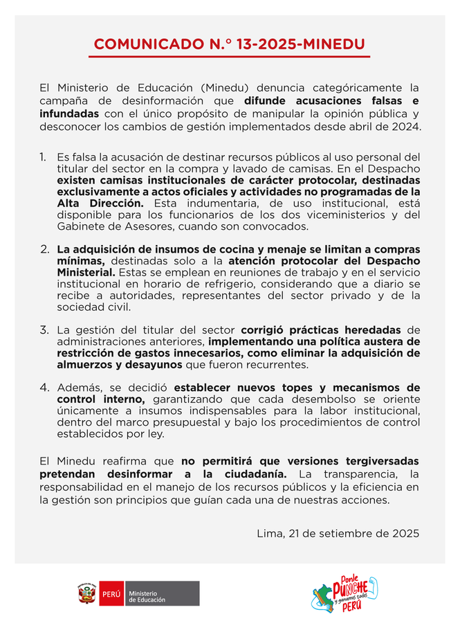 Por otro lado, mediante sus canales de difusión, la cartera de Educación se pronunció respecto a estos señalamientos para negar que sus fondos sean de uso personal del ministro Quero, asegurando que en el sector educación se realizaron estas compras para la dotación protocolar y para atención protocolar de reuniones.