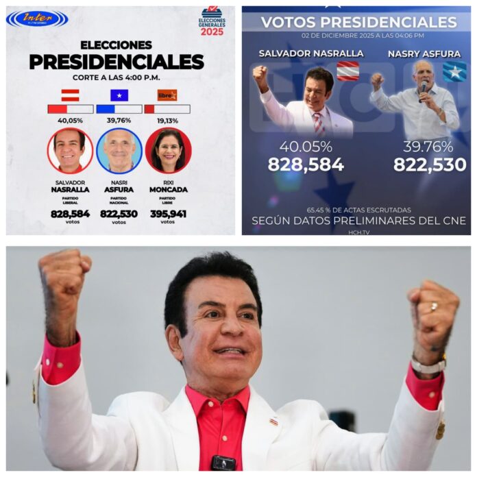 Al computarse el 65.45 por ciento de las actas del total, Nasralla encabeza el escrutinio con 40.05 por ciento, mientras Asfura, empresario de 67 años, quien recibió el respaldo del presidente de Estados Unidos, Donald Trump, se ubica segundo con 39.76 por ciento.
