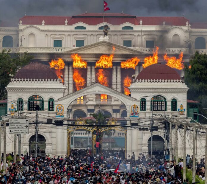 El histórico palacio de Singha Durbar en Katmandú, sede del gobierno, fue destruido este martes al ser incendiado por los manifestantes que irrumpieron en el complejo gubernamental. La escalada de la crisis también alcanzó al Parlamento nacional.