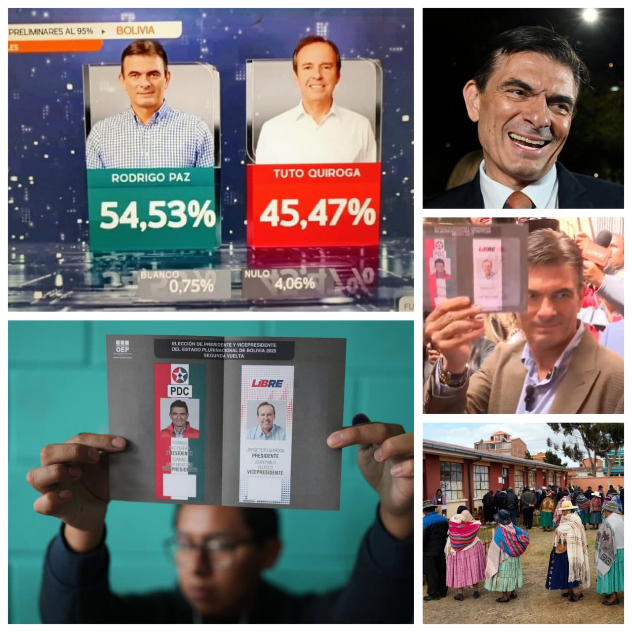 El aspirante Rodrigo Paz Pereira, del centroderechista Partido Demócrata Cristiano, será el próximo presidente de Bolivia por un quinquenio al imponerse hoy con el 54,57% de los votos frente al 45,43% del expresidente conservador Jorge “Tuto” Quiroga.