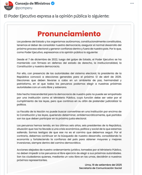 Finalmente, el pronunciamiento advierte que “acciones alejadas del orden jurídico, tomadas por el Ministerio Público, no deben impedir a los peruanos el libre ejercicio de elegir a sus próximas autoridades”. Y concluye reafirmando que será el pueblo, mediante un voto libre y soberano, quien decidirá el rumbo del país en las elecciones generales del 12 de abril de 2026.