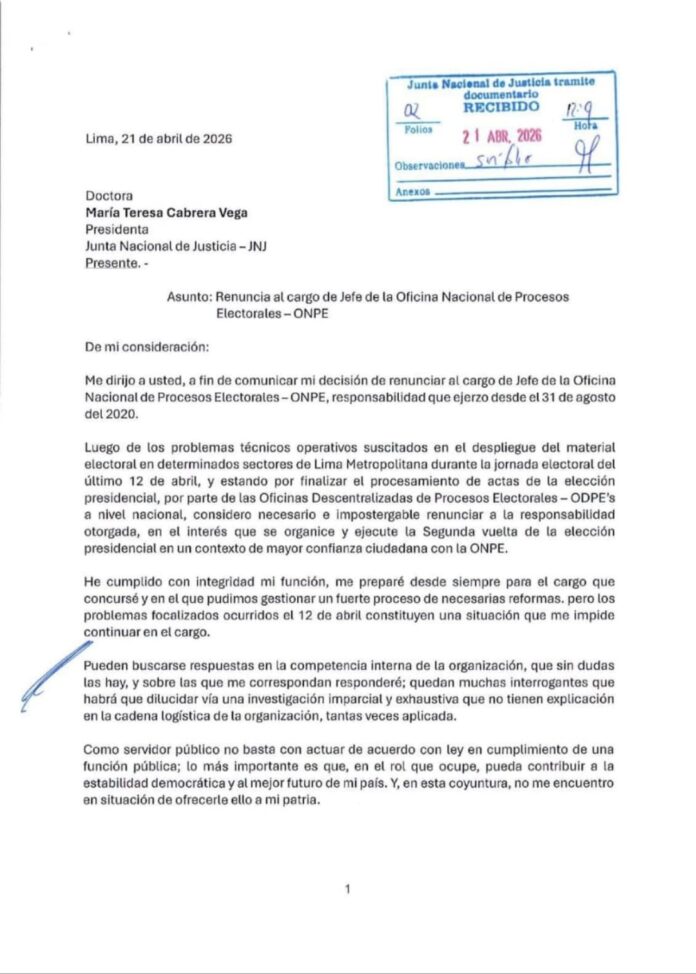 En dicho documento, el ahora renunciante del mencionado organismo, señala que, de manera impostergable, deja el cargo para que otra persona pueda asumir las funciones. La decisión la toma luego de los problemas suscitados en la entrega del material electoral en algunos sectores de Lima durante las elecciones del 12 de abril.