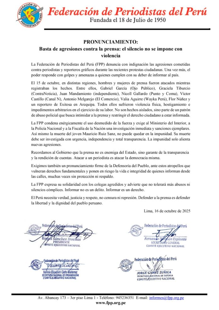 La Federación de Periodistas del Perú (FPP) denuncia con indignación las agresiones cometidas contra periodistas y reporteros gráficos durante las recientes protestas ciudadanas. Una vez más, el poder responde con golpes y amenazas a quienes cumplen con su deber de informar al país.
