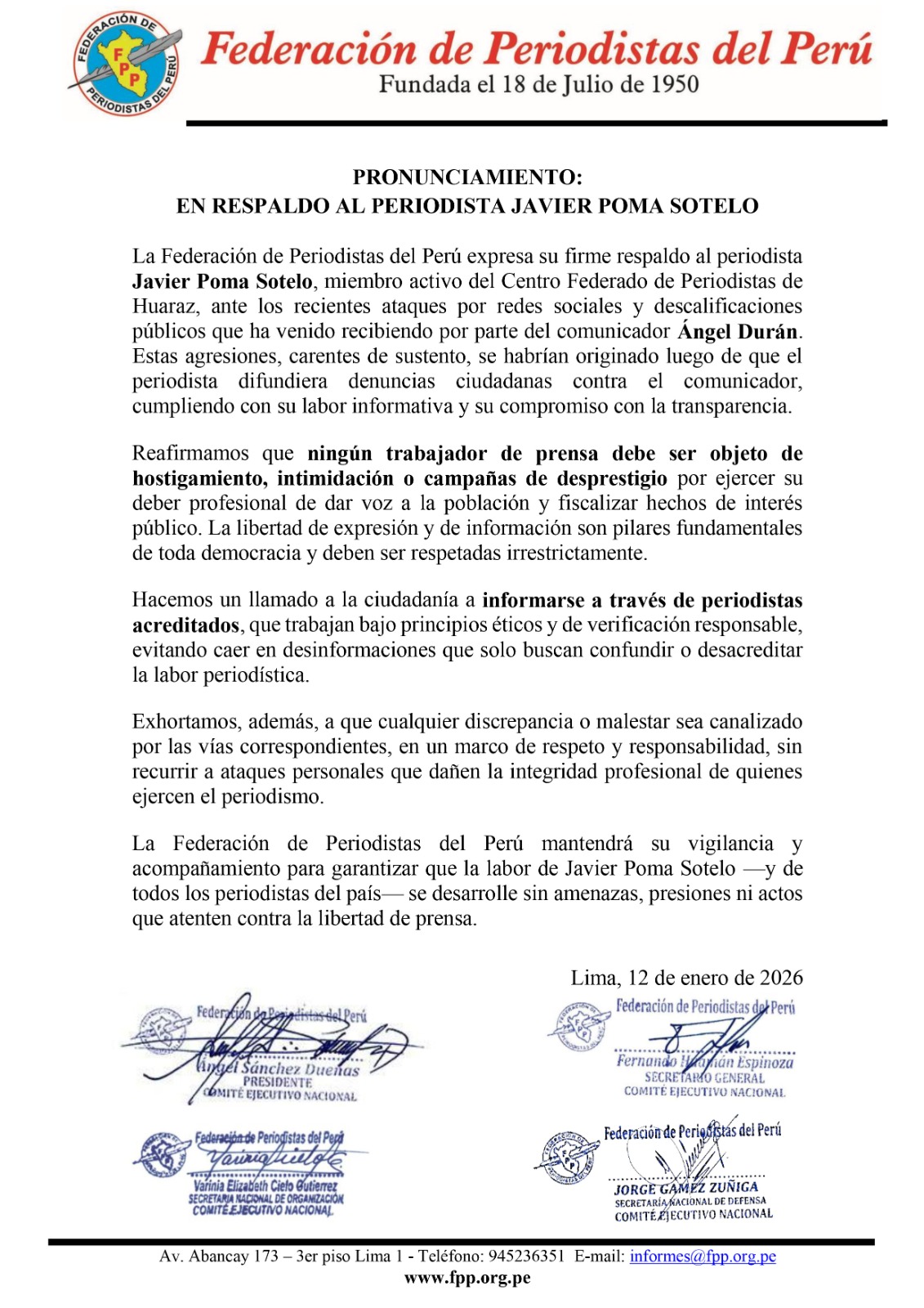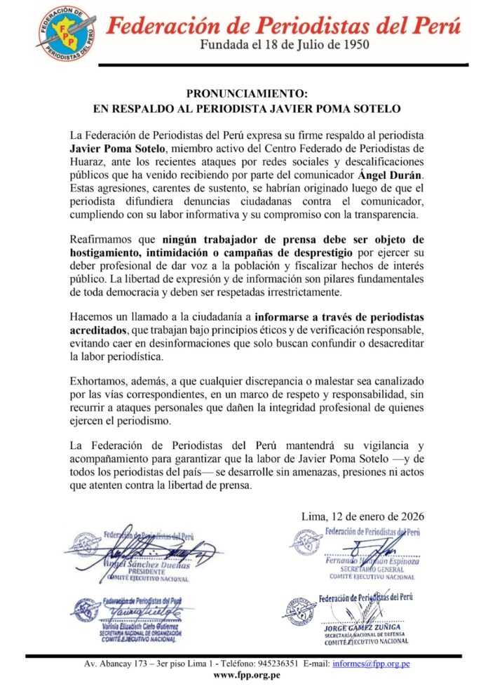La Federación de Periodistas del Perú expresa su firme respaldo al periodista Javier Poma Sotelo, miembro activo del Centro Federado de Periodistas de Huaraz, ante los recientes ataques por redes sociales y descalificaciones públicos que ha venido recibiendo por parte del comunicador Ángel Durán. Estas agresiones, carentes de sustento, se habrían originado luego de que el periodista difundiera denuncias ciudadanas contra el comunicador, cumpliendo con su labor informativa y su compromiso con la transparencia.