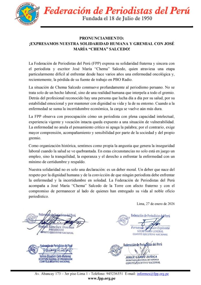 La Federación de Periodistas del Perú (FPP) expresa su solidaridad fraterna y sincera con el periodista y escritor José María “Chema” Salcedo, quien atraviesa una etapa particularmente difícil al enfrentar desde hace varios años una enfermedad oncológica y, recientemente, la pérdida de su fuente de trabajo en PBO Radio.