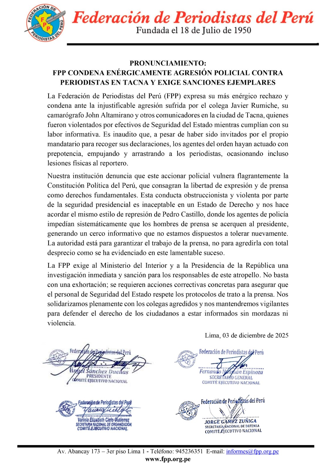 La Federación de Periodistas del Perú (FPP) expresa su más enérgico rechazo y condena ante la injustificable agresión sufrida por el colega Javier Rumiche, su camarógrafo John Altamirano y otros comunicadores en la ciudad de Tacna, quienes fueron violentados por efectivos de Seguridad del Estado mientras cumplían con su labor informativa. Es inaudito que, a pesar de haber sido invitados por el propio mandatario para recoger sus declaraciones, los agentes del orden hayan actuado con prepotencia, empujando y arrastrando a los periodistas, ocasionando incluso lesiones físicas al reportero.