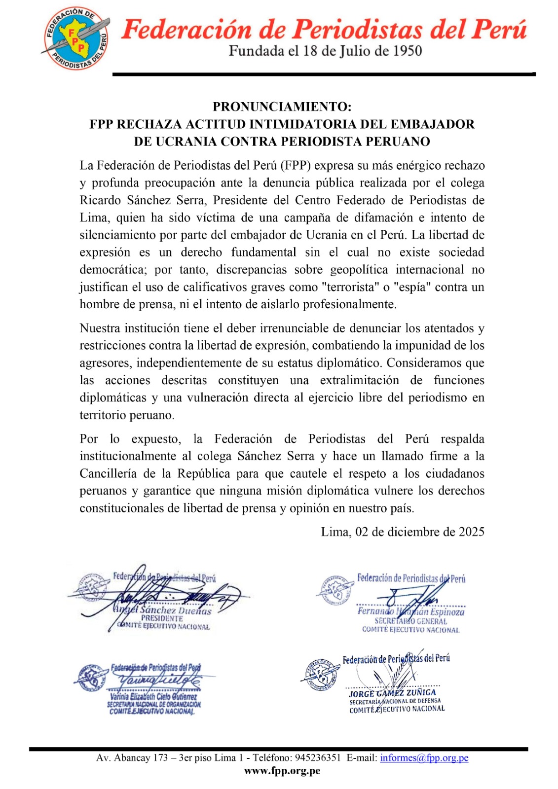 La Federación de Periodistas del Perú (FPP) expresa su más enérgico rechazo y profunda preocupación ante la denuncia pública realizada por el colega Ricardo Sánchez Serra, Presidente del Centro Federado de Periodistas de Lima, quien ha sido víctima de una campaña de difamación e intento de silenciamiento por parte del embajador de Ucrania en el Perú. La libertad de expresión es un derecho fundamental sin el cual no existe sociedad democrática; por tanto, discrepancias sobre geopolítica internacional no justifican el uso de calificativos graves como «terrorista» o «espía» contra un hombre de prensa, ni el intento de aislarlo profesionalmente.