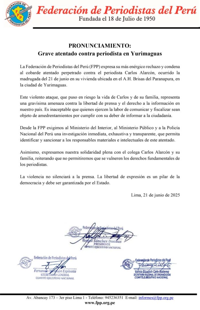 La Federación de Periodistas del Perú (FPP) expresa su más enérgico rechazo y condena al cobarde atentado perpetrado contra el periodista Carlos Alarcón, ocurrido la madrugada del 21 de junio en su vivienda ubicada en el A.H. Brisas del Paranapura, en la ciudad de Yurimaguas.
