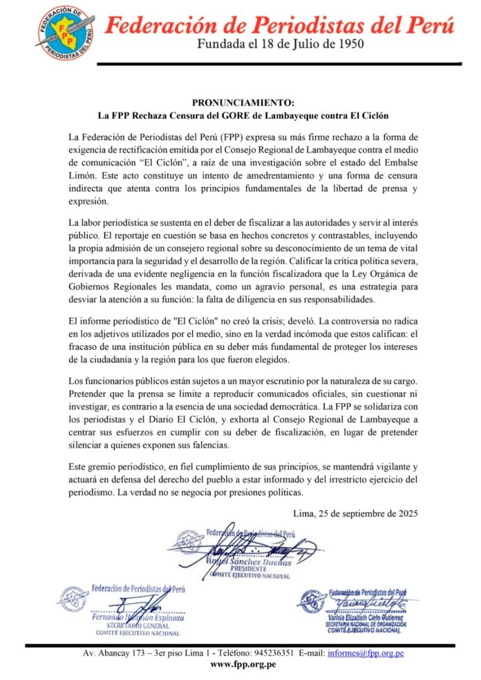 La Federación de Periodistas del Perú (FPP) expresa su más firme rechazo a la forma de exigencia de rectificación emitida por el Consejo Regional de Lambayeque contra el medio de comunicación “El Ciclón”, a raíz de una investigación sobre el estado del Embalse Limón. Este acto constituye un intento de amedrentamiento y una forma de censura indirecta que atenta contra los principios fundamentales de la libertad de prensa y expresión.