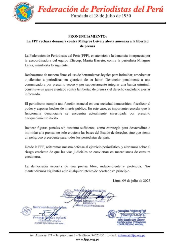 La Federación de Periodistas del Perú (FPP), en atención a la denuncia interpuesta por la excoordinadora del equipo Eficcop, Marita Barreto, contra la periodista Milagros Leiva, manifiesta lo siguiente: