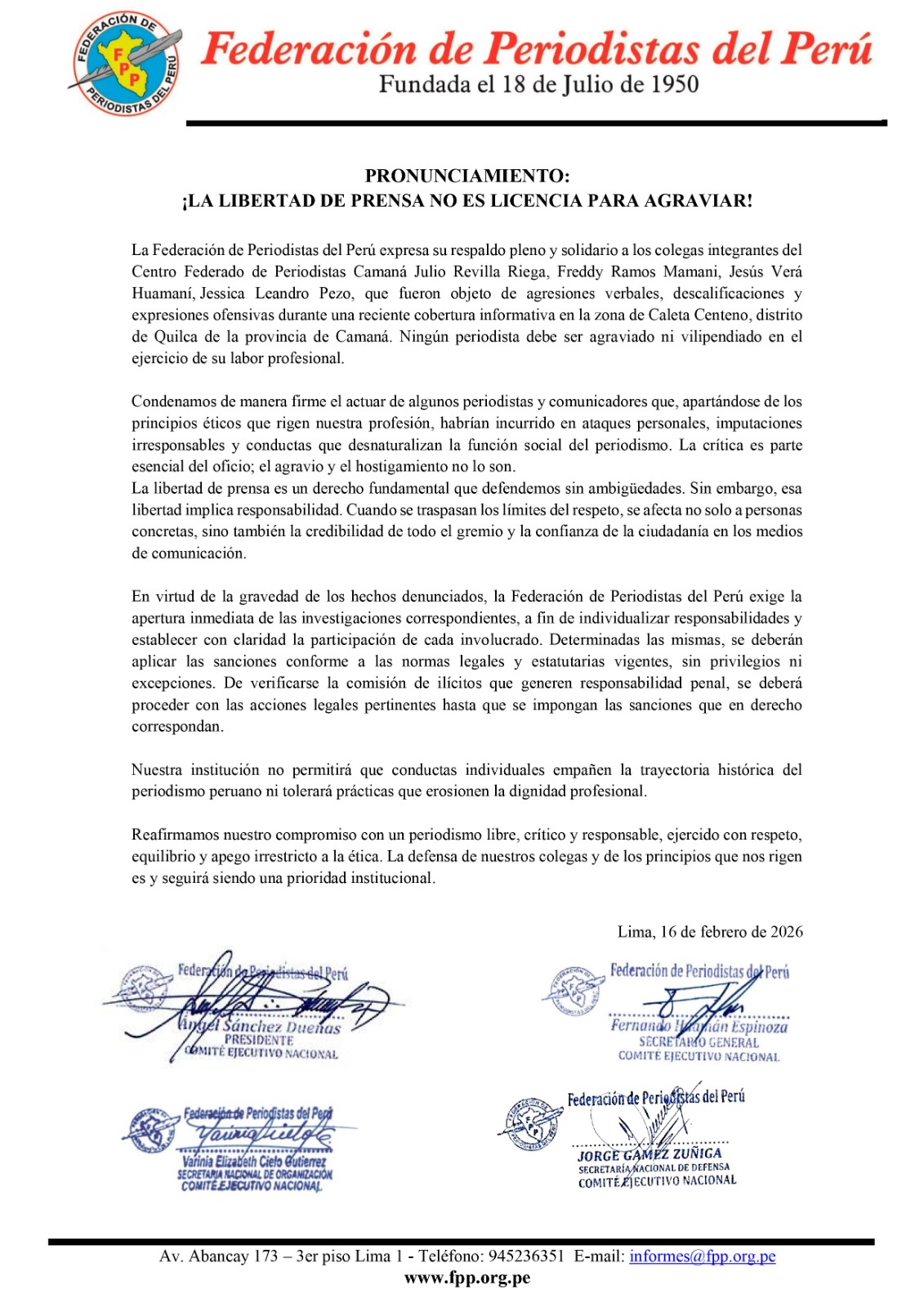 La Federación de Periodistas del Perú expresa su respaldo pleno y solidario a los colegas integrantes del Centro Federado de Periodistas Camaná Julio Revilla Riega, Freddy Ramos Mamani, Jesús Verá Huamaní,  Jessica Leandro Pezo, que fueron objeto de agresiones verbales, descalificaciones y expresiones ofensivas durante una reciente cobertura informativa en la zona de Caleta Centeno, distrito de Quilca de la provincia de Camaná. Ningún periodista debe ser agraviado ni vilipendiado en el ejercicio de su labor profesional.