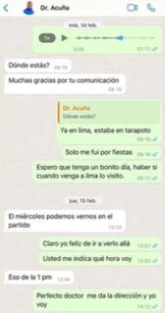 “Dónde estás? Muchas gracias por tu comunicación”, menciona Acuña. “Ya en Lima, estaba en Tarapoto. Solo me fui por fiestas. Espero que tenga un bonito día, haber si cuando venga a Lima lo visito”, responde Pinedo.
