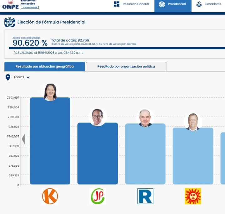 De acuerdo a la contabilización de actas al 90.62 %, reportada esta mañana, Keiko Fujimori, de extrema derecha, lidera el conteo con 2.589 millones 067 votos, seguida por el izquierdista Sánchez, actual congresista.