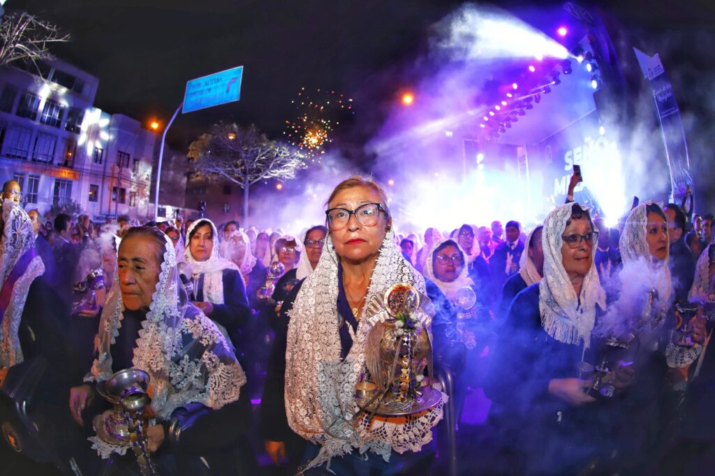 Sahumadoras y cantoras que acompañan la procesión del Señor de los Milagros.