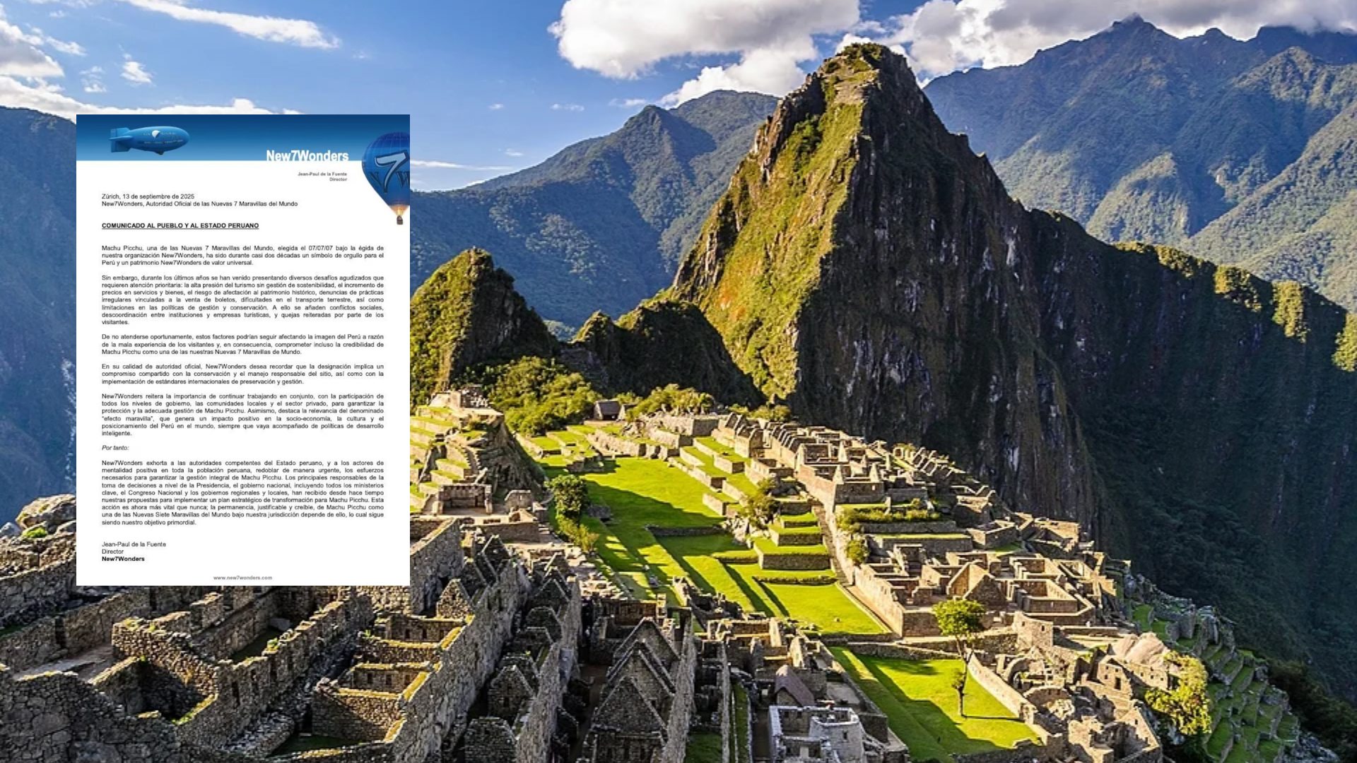 Estos problemas de gestión y conservación ya no son solamente advertencias locales, sino señales de que Machu Picchu podría dejar de cumplir los estándares de credibilidad exigidos para mantener su reconocimiento global. Aunque, el Ministerio de Cultura indicó que: “el santuario histórico de Machu Picchu no ha sido incluido en la lista de patrimonio mundial en peligro según la Unesco”; dicha aclaración, no desmiente el comunicado lanzado por New7Wonders.