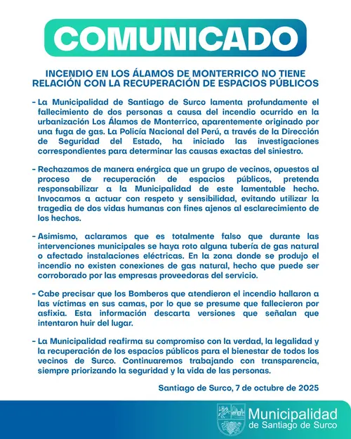 En tanto, la propia Municipalidad emitió un comunicado desvinculando totalmente el accidente ocurrido con el proceso de recuperación de espacios públicos que se viene realizando en la zona. Asimismo, aclaró que durante las intervenciones municipales no se rompió ni afectó ninguna tubería o instalación eléctrica.