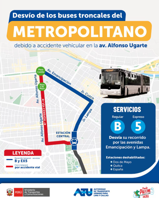 Según informó la Autoridad de Transporte Urbano (ATU), el vehículo conocido como “Anconero” invadió la pista por donde solo transitan las unidades del Metropolitano, siendo una de ellas la golpeada. Debido a este terrible choque, los buses del Metropolitano desviaron sus recorridos por las avenidas Lampa y Emancipación.