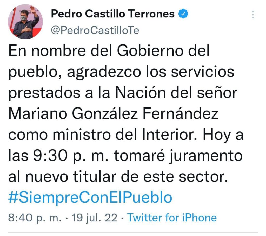 Huerta Olivas entra como ministro en reemplazo de Mariano González Fernández, y se convierte así en el séptimo titular del Mininter, en los casi doce meses de mandato del presidente Castillo.